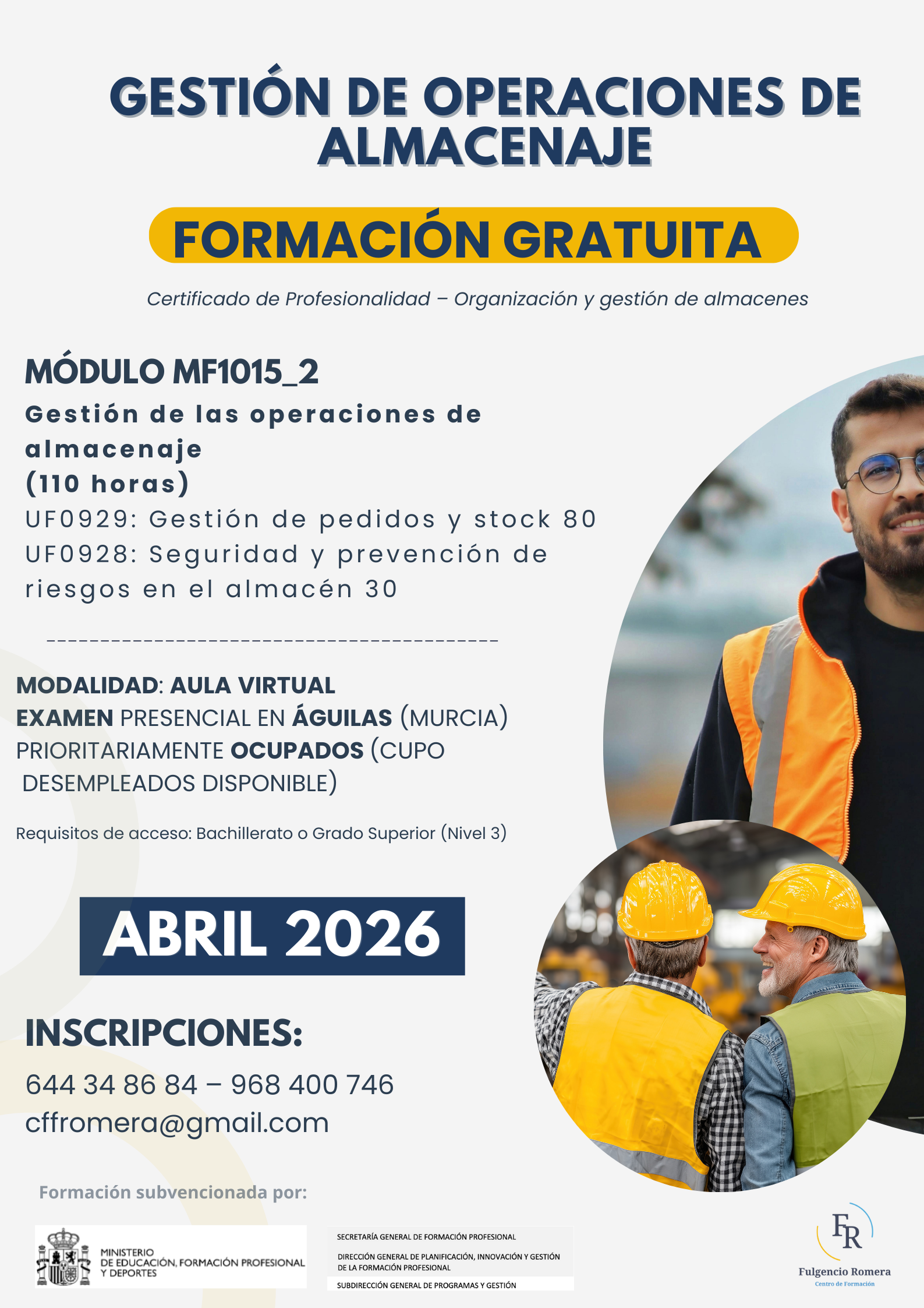 Curso gratuito de Gestión de Operaciones de Almacenaje (MF1015_2) de 110 horas, en modalidad aula virtual con examen presencial en Águilas (Murcia).